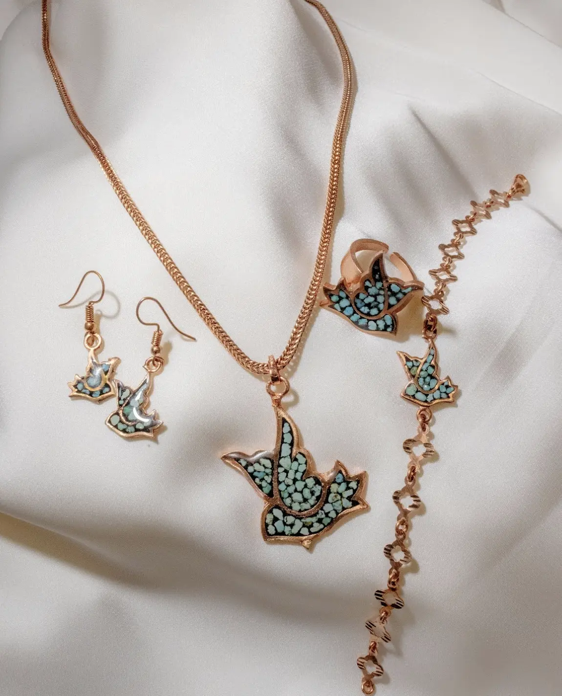 The set includes a pendant necklace, matching earrings, an adjustable ring, and a coordinating bracelet. Each piece is individually handcrafted, resulting in subtle variations in stone placement and metal detailing that enhance its artisanal character. Designed to be worn as a complete ensemble or styled individually, this set bridges Persian heritage with contemporary elegance, suitable for everyday wear or meaningful occasions.