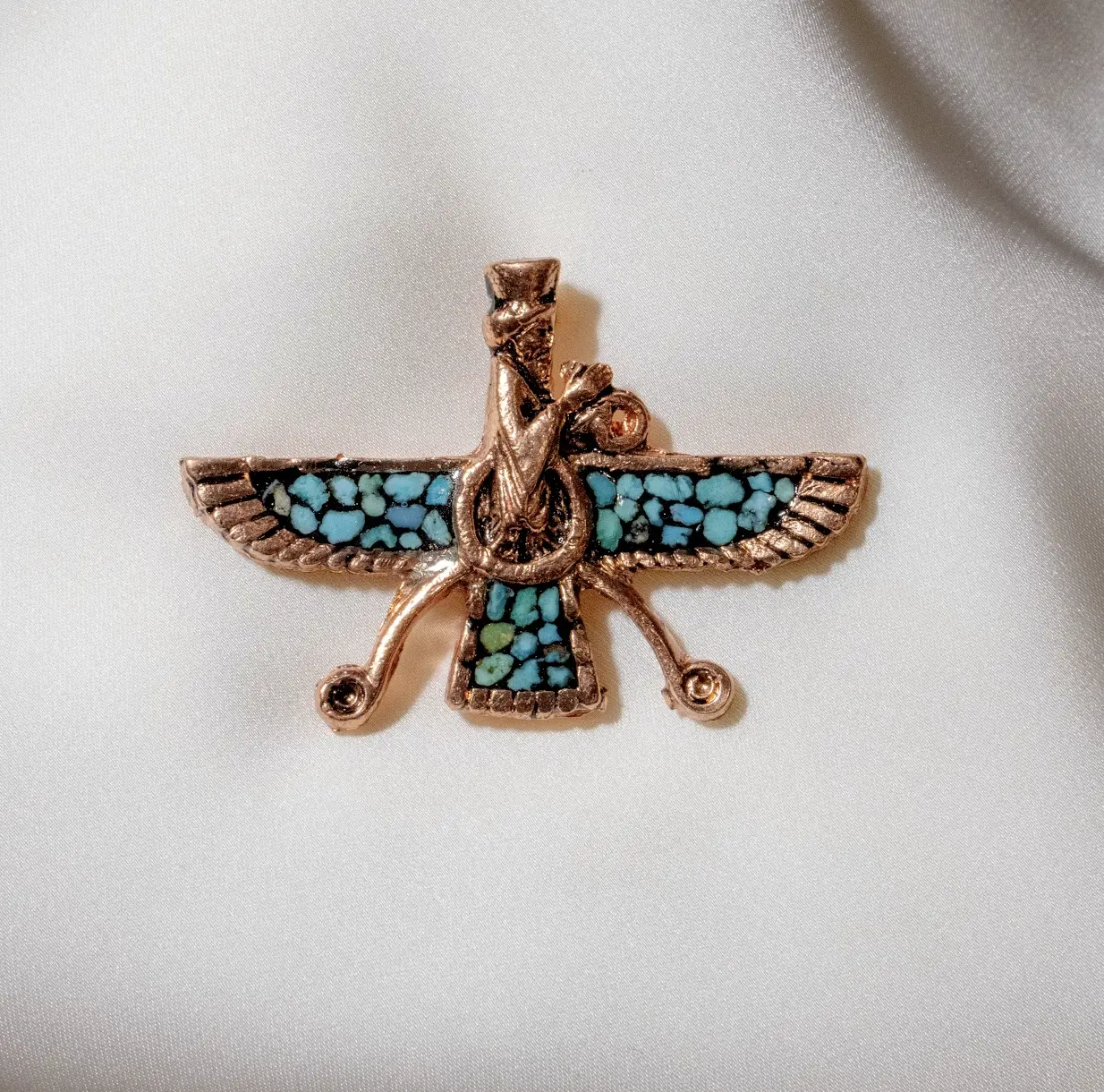 Copper Faravahar pendant inlaid with natural turquoise stones, symbolizing spiritual growth, wisdom, and ethical living. A powerful Persian heritage amulet.