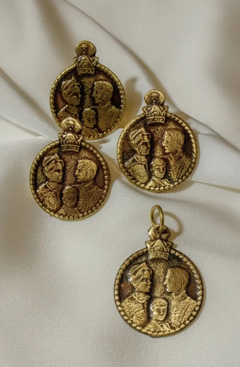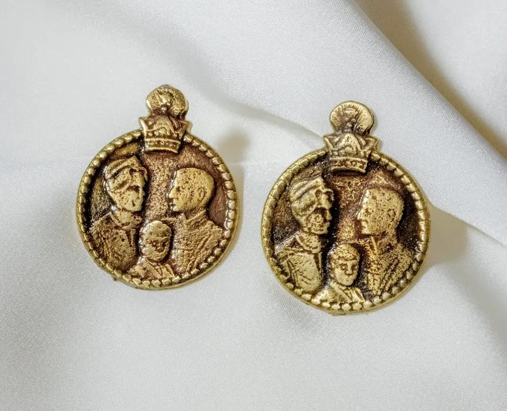 Rendered in an antique gold-toned copper finish, each piece carries the visual language of vintage coinage and royal seals, blending historical reference with wearable art. Rather than functioning as political expression, this set serves as a cultural and historical homage—preserving memory, identity, and craftsmanship through form.