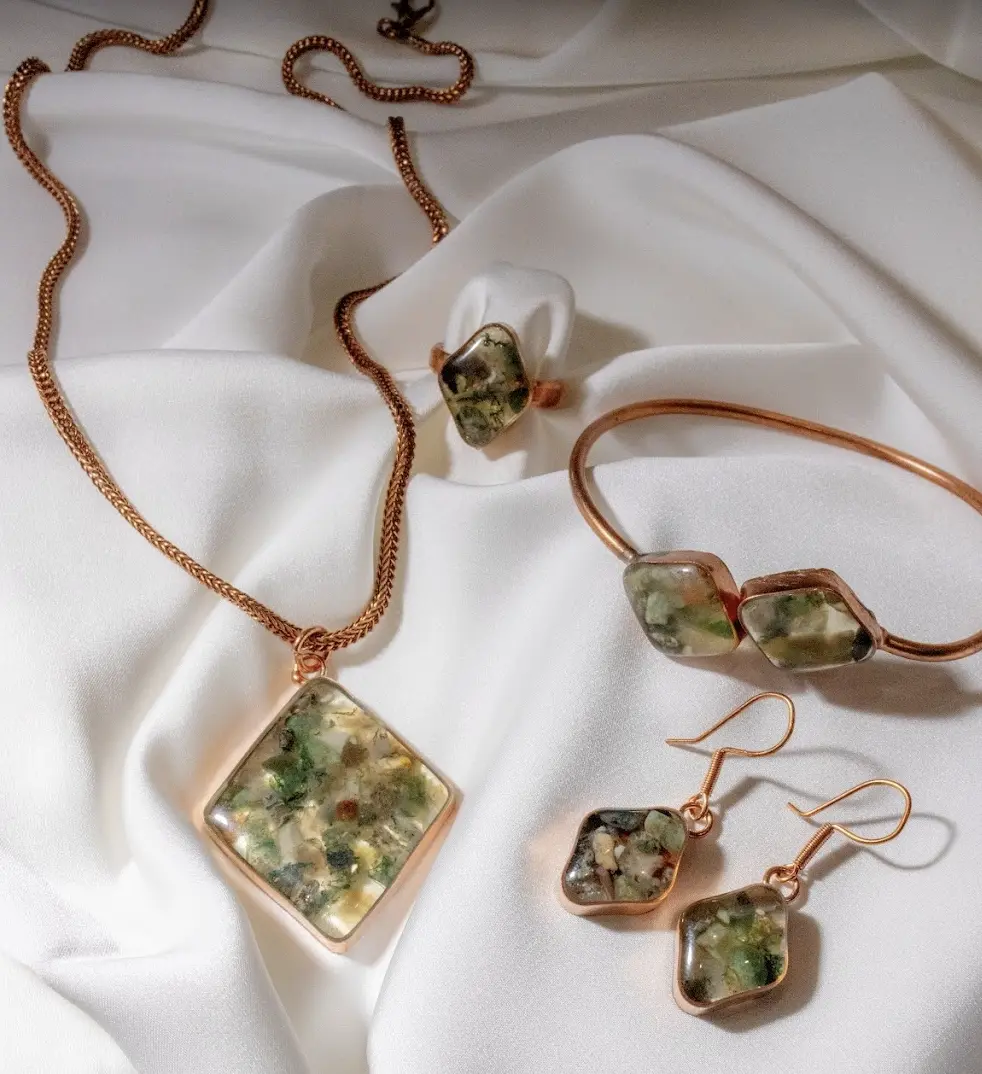 The Nature Relic Set evokes the quiet power of ancient artifacts shaped by earth, time, and natural landscapes. Inspired by relics formed through nature’s slow artistry, this set balances raw organic expression with refined craftsmanship. Green natural stone elements rest within warm copper frames, preserving their earthy texture while presenting a contemporary silhouette.