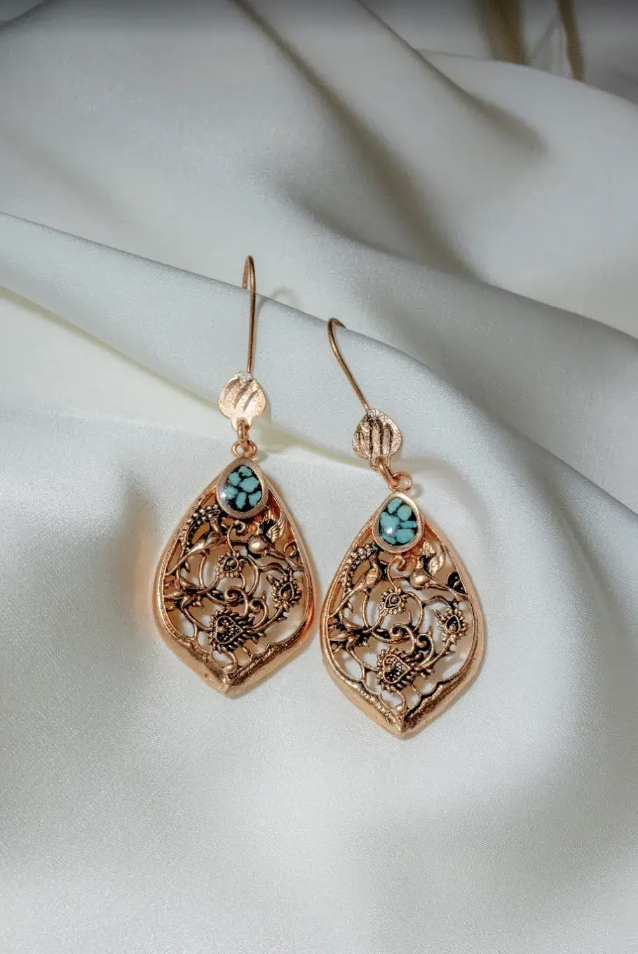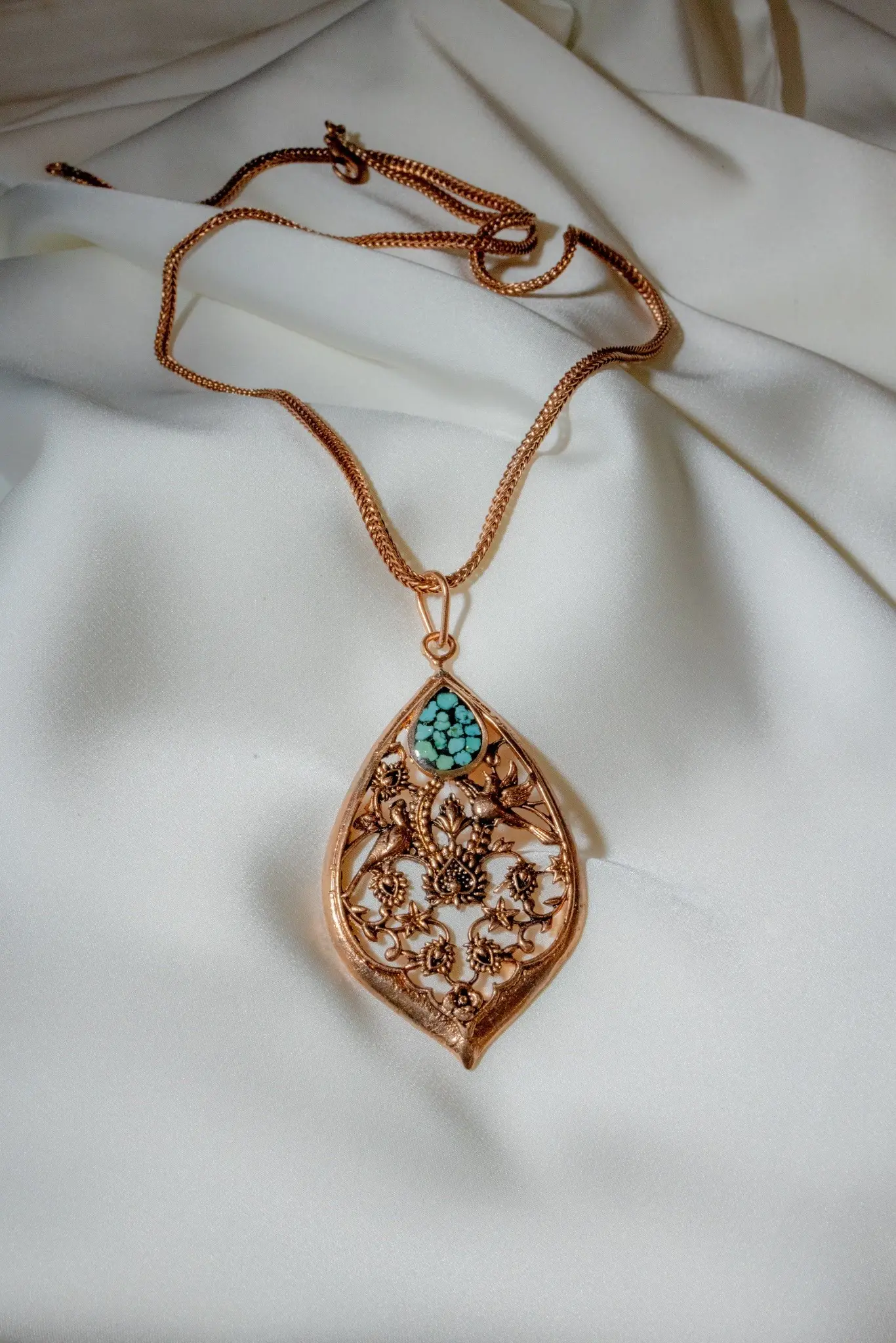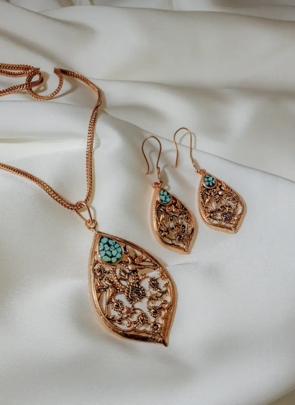 This handcrafted pendant features an intricate Persian filigree design accented with natural turquoise stones. The teardrop form is inspired by traditional Iranian ornamentation, symbolizing protection, harmony, and spiritual balance. Turquoise has long held a sacred place in Persian culture, believed to bring calm, protection, and positive energy to the wearer.