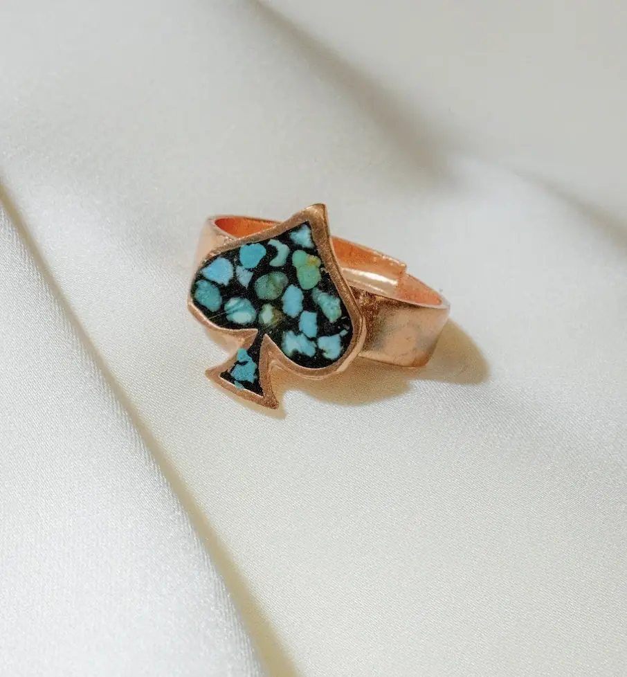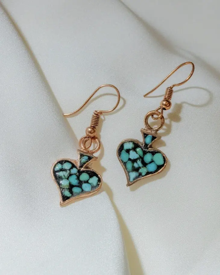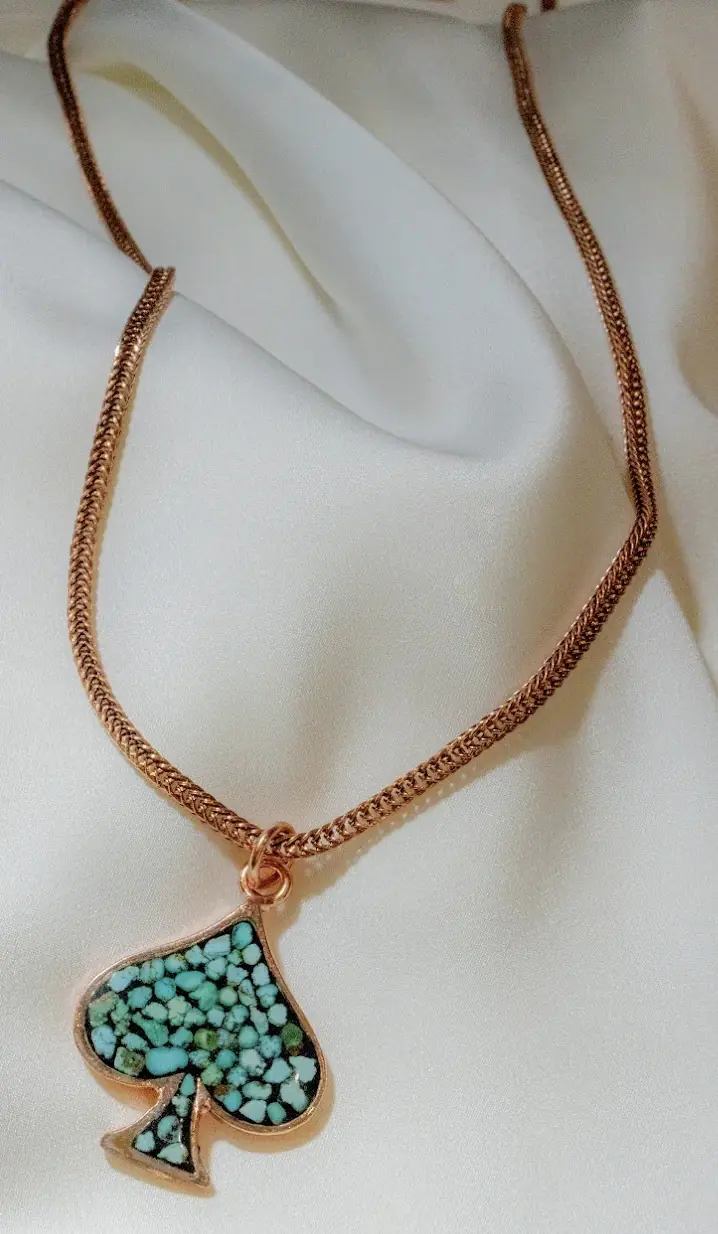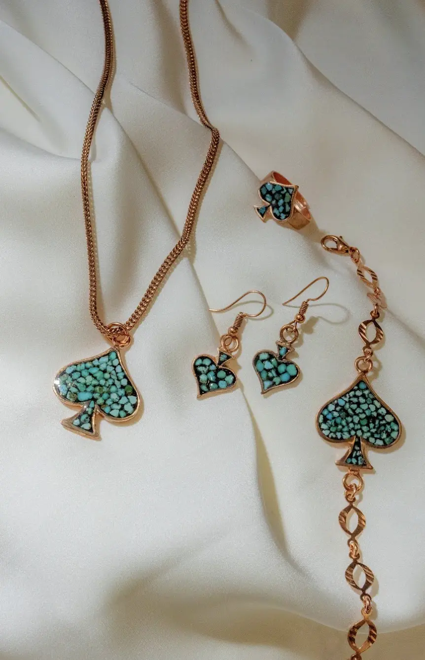 This handcrafted jewelry set features a distinctive spade-inspired motif filled with turquoise stone, blending symbolic form with traditional Iranian craftsmanship. The spade shape, reimagined through a Persian artistic lens, represents protection, strength, and continuity, while the use of turquoise connects the piece to centuries of Iranian cultural and spiritual tradition.