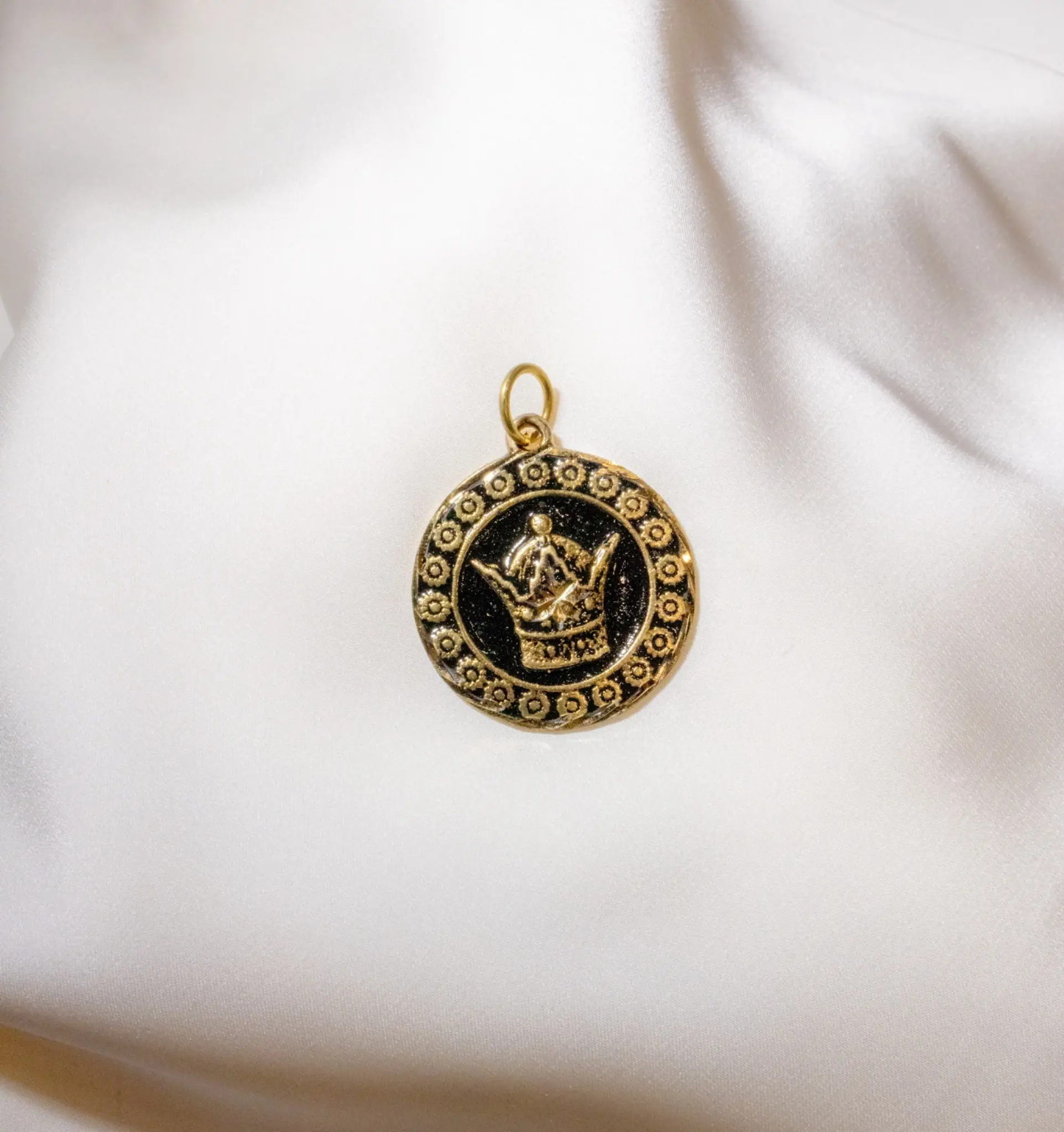 Designed in a circular form, the pendant combines textured borders with a central emblem, creating a balanced and timeless composition. The relief-style crown stands prominently against a darkened background, enhancing contrast and visual depth. This piece reflects an appreciation for historical symbolism while remaining wearable in a modern context.