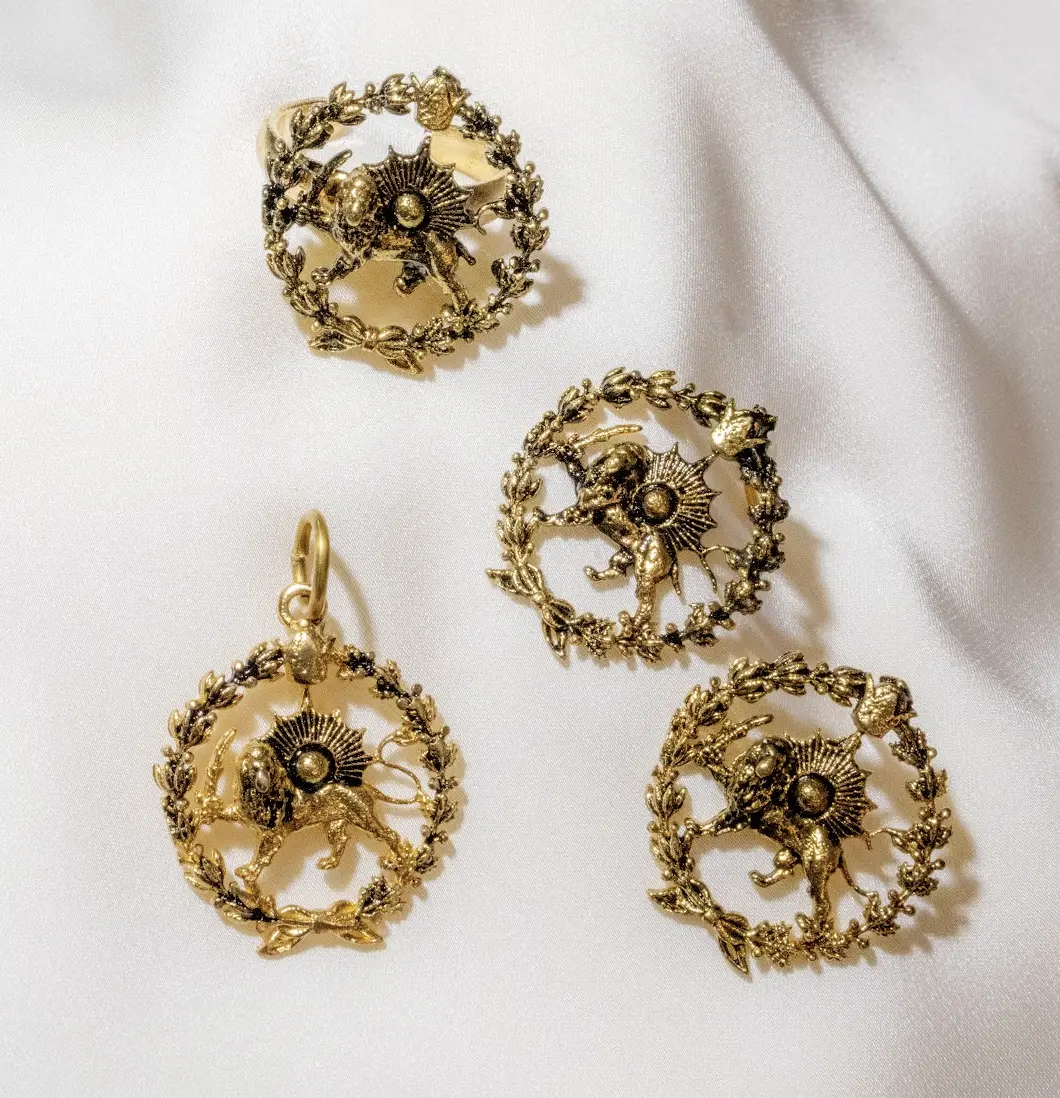 Crafted from a copper-alloy base and finished with gold plating, the set balances durability with an antique, heritage finish. The set includes a pendant necklace, matching earrings, and a coordinating ring — designed to be worn together as a statement of cultural pride or individually for subtle symbolism.