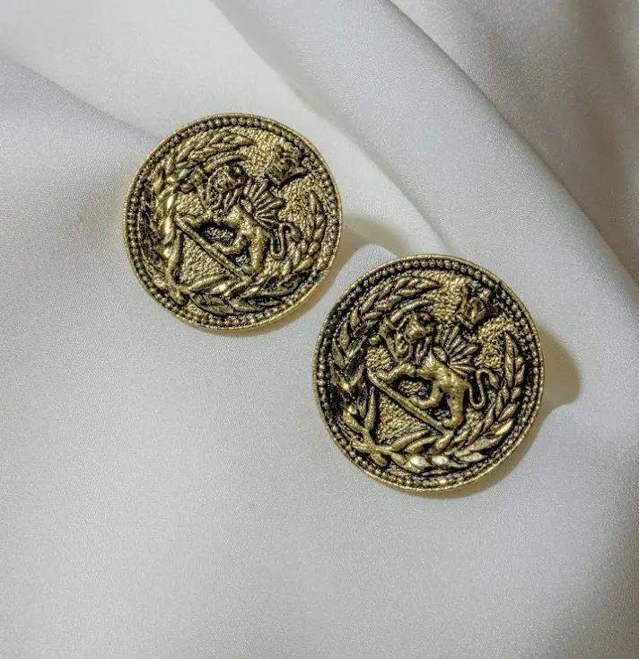 In this Laurel Medallion variation, the central Lion and Sun motif is surrounded by intricate inner decorative elements inspired by laurel wreaths and ceremonial ornamentation found in historical Persian coinage and emblems. These details symbolize honor, legacy, and continuity, distinguishing this design from the classic Shir-o-Khorshid medallion. Finished in an antique gold tone, the textured relief enhances depth and dimension while preserving a sense of historical continuity. This piece functions as a cultural homage rather than a political statement, emphasizing heritage, symbolism, and craftsmanship.