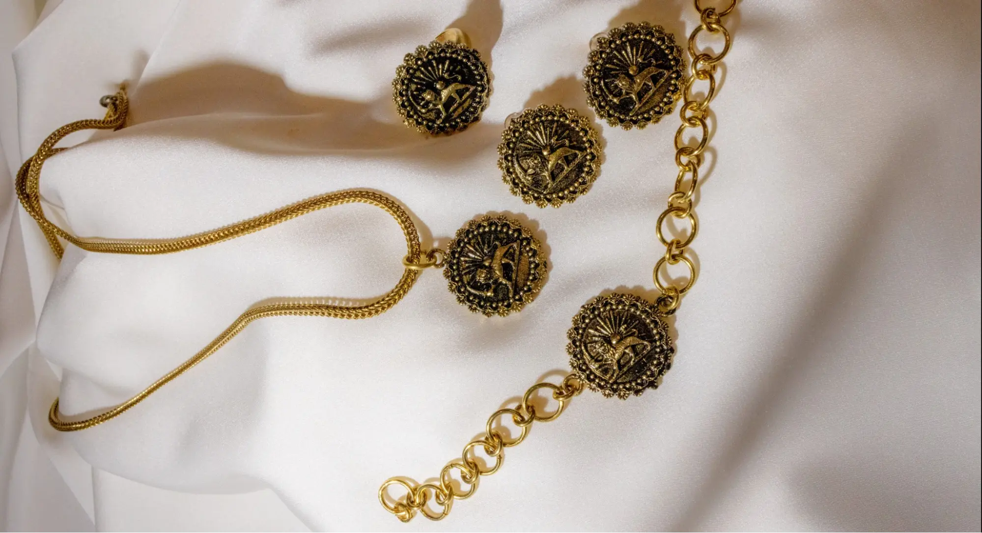 The set includes a pendant necklace, matching earrings, an adjustable ring, and a coordinating bracelet. Each piece is individually handcrafted, resulting in subtle variations in texture and detailing that highlight its artisanal character. Designed to be worn as a complete ensemble or styled individually, this set serves as a meaningful statement of Persian heritage and timeless elegance.