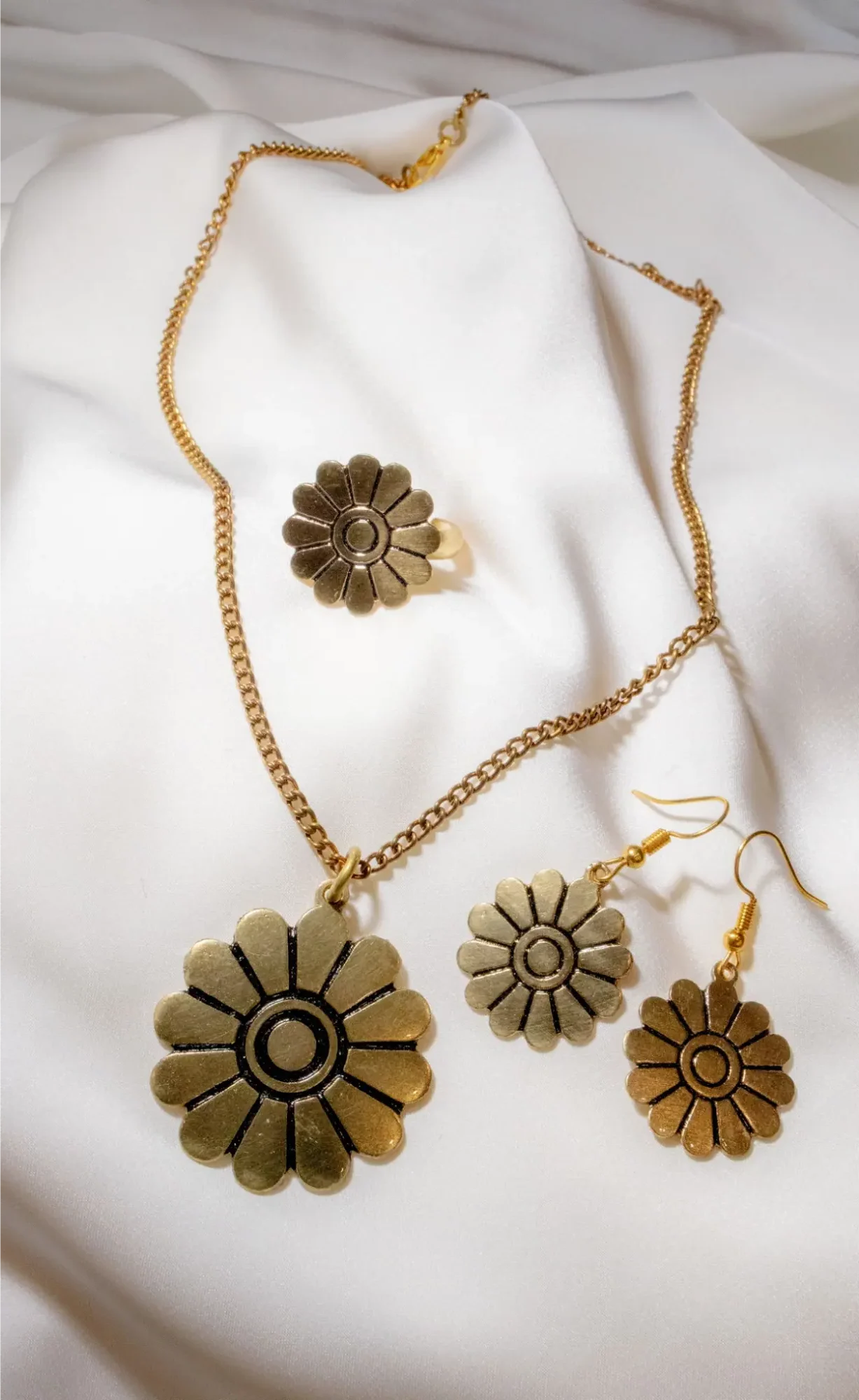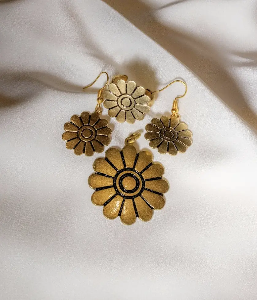 The set includes a pendant necklace, matching earrings, and an adjustable ring. Each piece is individually handcrafted, resulting in subtle variations in texture and tone that highlight its artisanal character. Designed to be worn together or styled individually, this set is suitable for everyday wear or meaningful occasions.