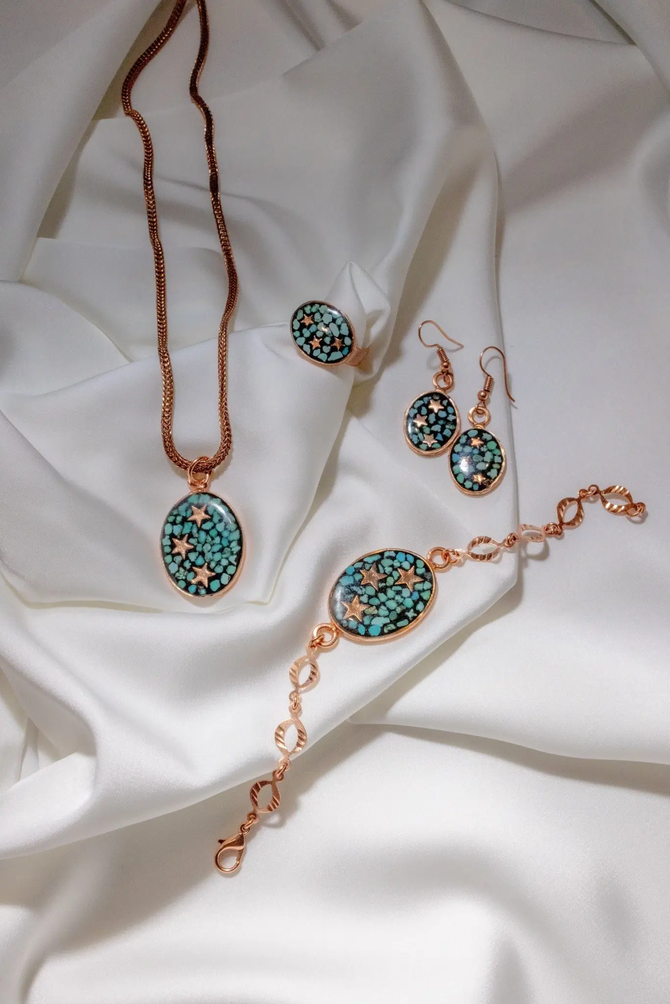 This handcrafted set includes a pendant necklace, matching drop earrings, a coordinating ring, and a bracelet. Turquoise stones are carefully arranged in a mosaic-style composition within copper frames, reflecting traditional Iranian decorative techniques. The star motifs evoke spiritual illumination and celestial balance, connecting the wearer to ancient concepts of light, clarity, and continuity.