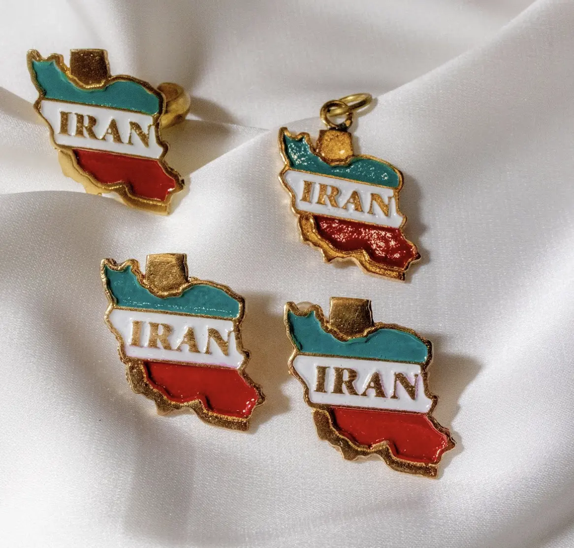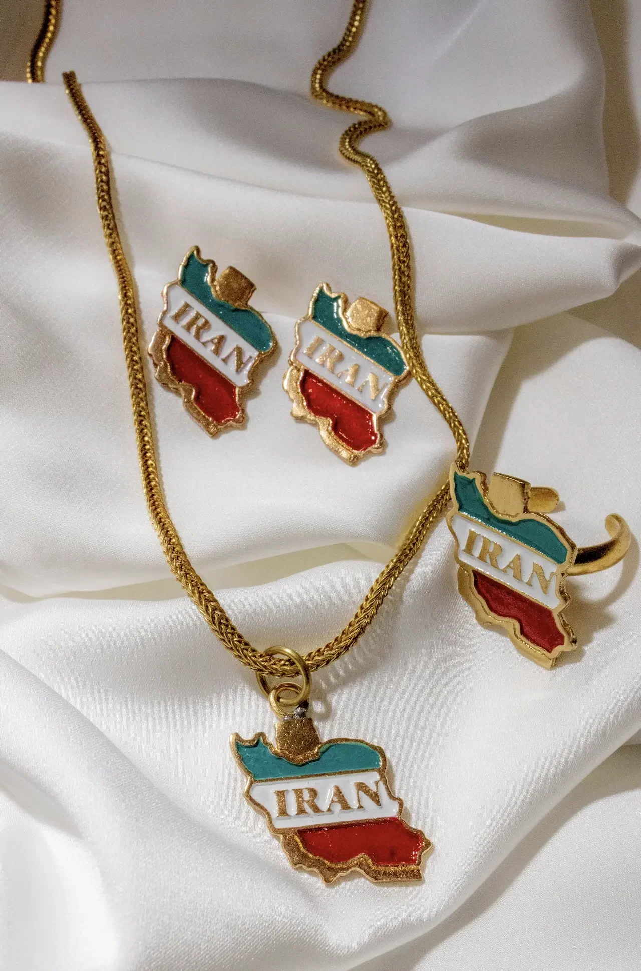 This handcrafted jewelry set features the map of Iran rendered in the traditional Persian tricolor palette of green, white, and red, with the word IRAN prominently displayed at the center. Titled Voice of Iran, the design represents identity, cultural pride, and a clear expression of belonging to Persian heritage.