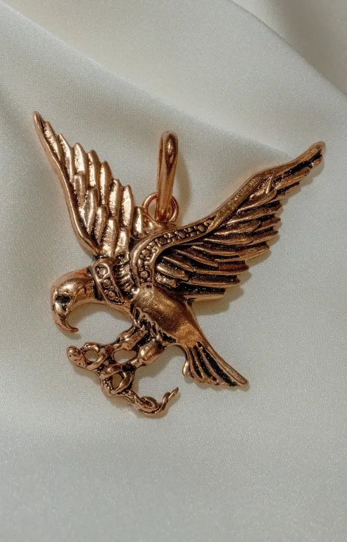 Crafted from copper with an antique finish, the pendant carries warmth, character, and symbolic resonance. It is designed to be worn as a statement of independence, imagination, and spiritual flight.