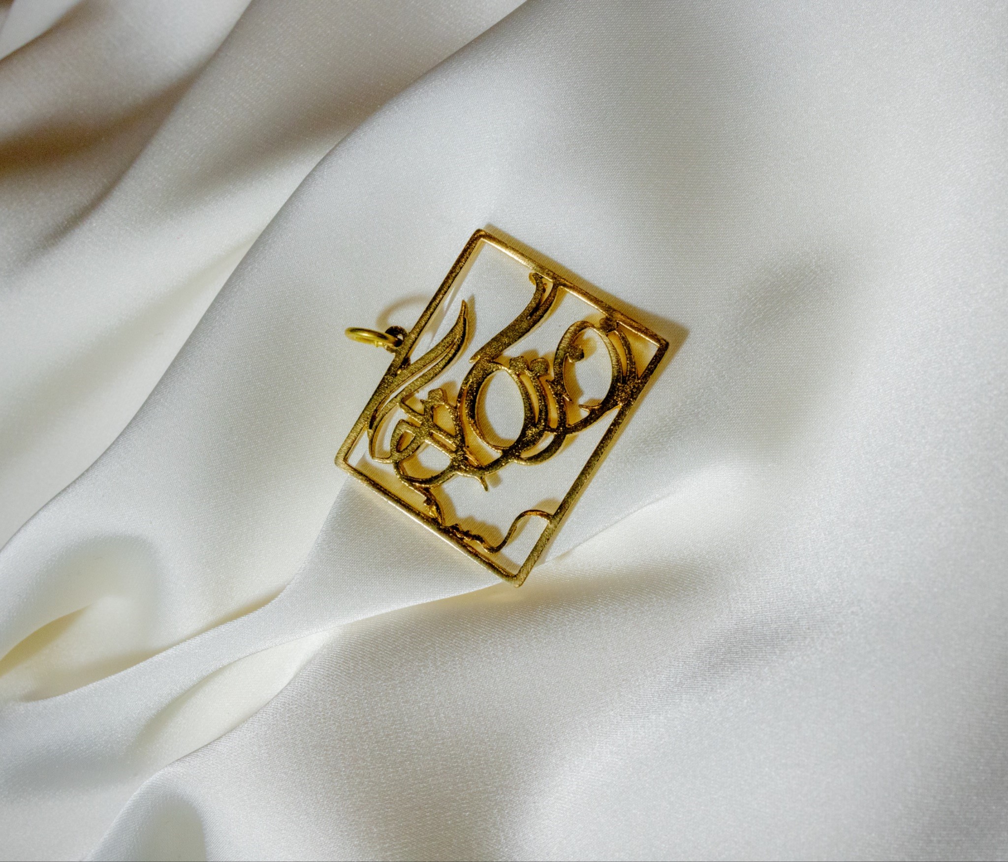 Crafted primarily from copper and finished in a gold-toned plating, the pendant balances bold symbolism with refined minimalism. The open-frame structure allows light to pass through the calligraphy, emphasizing both presence and openness. This piece comes with a matching chain and is designed to be worn close to the heart, either as daily wear or as intentional adornment.